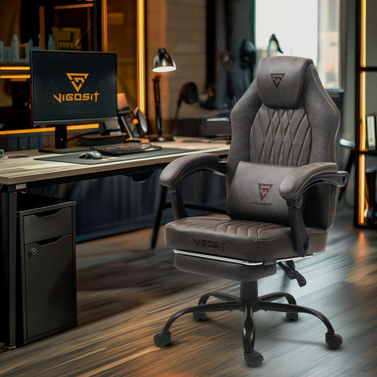 Vigosit High-Back Gaming Chair – Adjustable Ergonomic Computer Chair with Vintage Leather, Lumbar Massage Function & Pull-Out Footrest for Home & Office (Basic Brown)