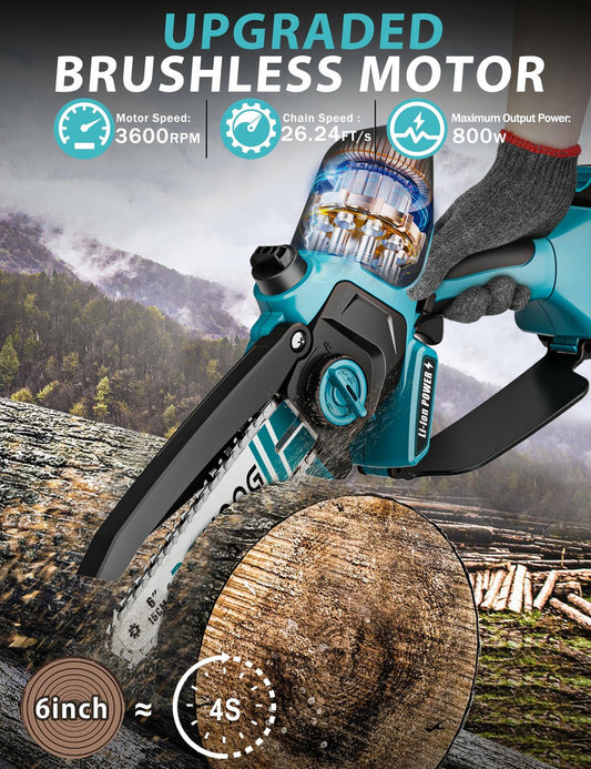 BEI & HONG Mini Chainsaw Cordless 6 Inch | 800W Brushless Motor | Switch Security Lock | Upgraded Chain Automatic Oil | Tool Free Lnstallation Design | Handheld Small Chainsaw for Cutting
